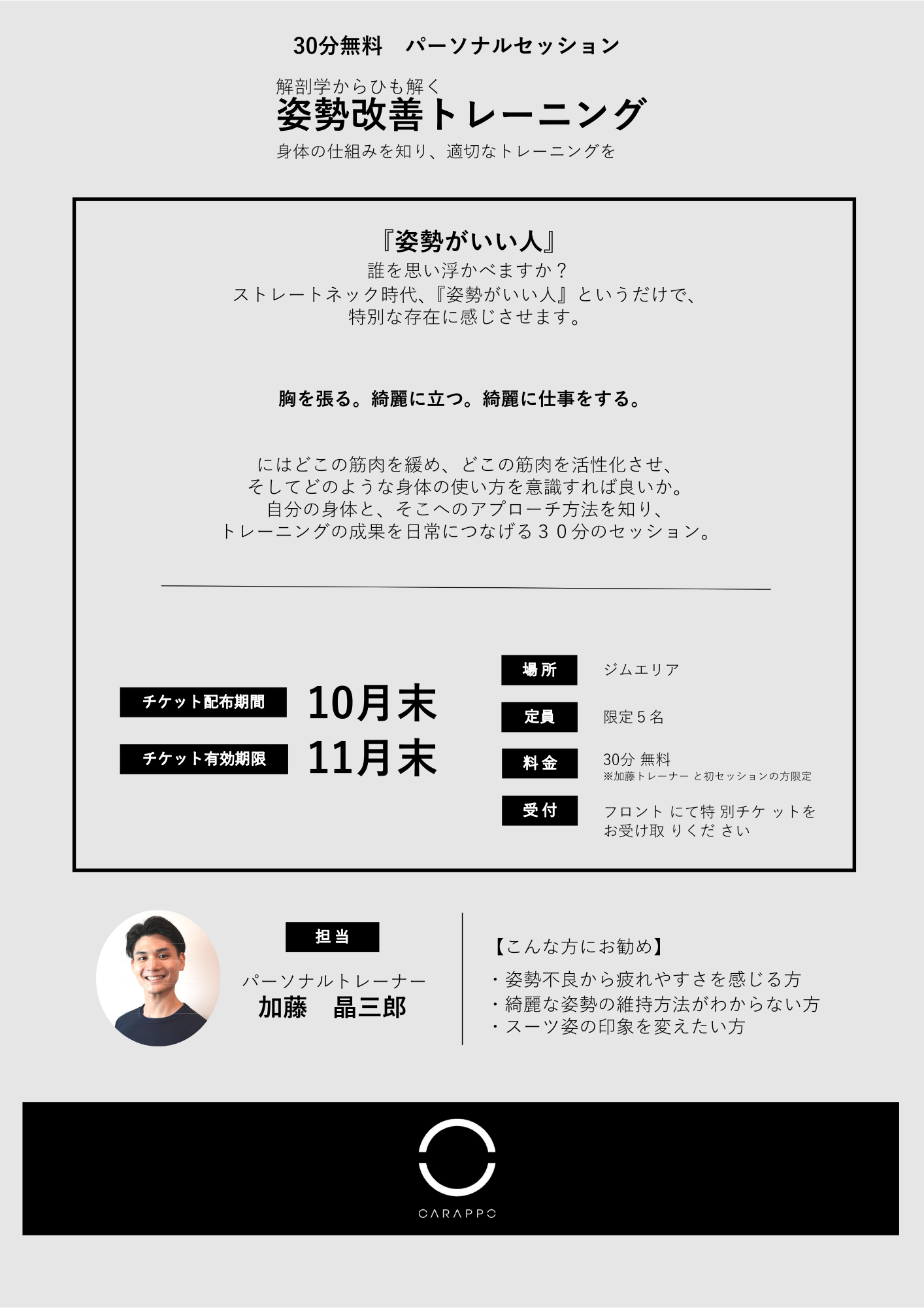 このたび、 加藤トレーナー による30分無料パーソナルセッションを実施いたします。